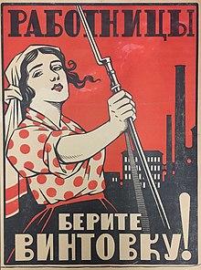 The only nation to deploy female combat troops in substantial numbers was Russia. From the onset, female recruits either joined the military in disguise or were tacitly accepted by their units. The most prominent were a contingent of front-line light cavalry in a Cossack regiment commanded by a female colonel, Alexandra Kudasheva. Others included Maria Bochkareva, who was decorated three times and promoted to senior NCO rank, while The New York Times reported that a group of twelve schoolgirls from Moscow had enlisted together disguised as young men.[9] In 1917, the Provisional Government raised a number of "Women's Battalions", with Bochkareva given an officer's commission in command. They were disbanded before the end of the year. In the later Russian Civil War, they fought both for the Bolsheviks (infantry) and the White Guard.[10]
