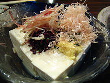 Hiyayakko (冷奴, cold tofu) is a Japanese dish made with chilled tofu and toppings.