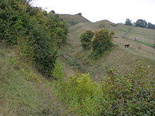 Hod Hill (or Hodd Hill) is a large hill fort in the Blackmore Vale, 3 miles (5 km) north-west of Blandford Forum, Dorset, England. The fort sits on a 143 m (469 ft) chalk hill of the same name that lies between the adjacent Dorset Downs and Cranborne Chase. The hill fort at Hambledon Hill is just to the north. The name probably comes from Old English "hod", meaning a shelter, though "hod" could also mean "hood", referring to the shape of the hill.[1]