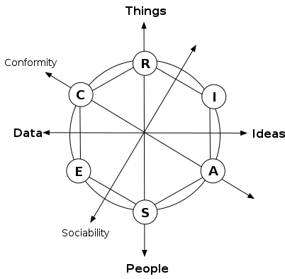 Holland originally labeled his six types as "motoric, intellectual, esthetic, supportive, persuasive, and conforming".[2] He later developed and changed them to: "Realistic (Doers), Investigative (Thinkers), Artistic (Creators), Social (Helpers), Enterprising (Persuaders), and Conventional (Organizers)".[7] Holland's six categories show some correlation with each other.[8] It is called the RIASEC model or the hexagonal model because the initial letter of the region is equal to R-I-A-S-E-C when it is expressed as a circle connecting the regions of high correlation. Professor John Johnson of Penn State suggested that an alternative way of categorizing the six types would be through ancient social roles: "hunters (Realistic), shamans (Investigative), artisans (Artistic), healers (Social), leaders (Enterprising), and lorekeepers (Conventional)".[9]