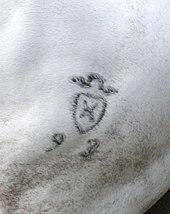 The easiest way to identify a Holsteiner is by the hot brand on the left hip, which is given to foals when they are inspected for their papers and passport.[8] Foals outside of the main registry can receive an alternate brand.[2] In most cases, the last two digits of the life number are part of the brand. Many male Holsteiners have names beginning in the letters "C" or "L" due to the dominance of male lines perpetuated by Cor de la Bryére, Cottage Son xx, and Ladykiller xx.[9] However, since Holsteiners from those families are used to add jumping ability to other warmblood breeding programs, non-Holstein warmbloods also often have those initials. Fillies, though, are named by year with I and J being the same year and Q and X not being used. For example, fillies born in 2008 and 1986 had names beginning in the letter "A".[9] The use of the sire's name as part of the name of his offspring is discouraged.[9]