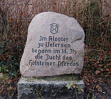 Organized horse breeding in Holstein was first conducted in the monasteries of Uetersen.[1] Monks were frequently the most literate members of Middle Ages societies, so accurate record-keeping depended on them. From the small native horses of the Haseldorf marshes, the Uetersen monks began to develop larger horses suitable for riding in times of war, and for agriculture in the demanding environment.[1][14]