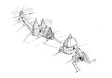 In the 15th century the entire gate construction was considered to be inadequate. The proliferation of firearms and canon made stronger fortifications necessary. It was decided to build another gate—the Outer Holsten Gate, later known as the Middle Holsten Gate and today only as the Holsten Gate. Funding was secured by a legacy of the councilman John Broling amounting to 4,000 Lübeck marks.[2] In 1464 the city's architect, Hinrich Helmstede, began construction, which was completed in 1478. It was erected on a seven-metre high hill raised for the purpose. Already during the construction period this foundation proved to be unstable. The south tower sagged because of the marshy ground and already during constructions attempts were made to compensate for its inclination.