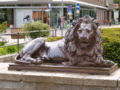 The two monumental iron statues of reclining lions placed in an area in front of the Holsten Gate designed by Harry Maasz date from 1823 and are unsigned. They are attributed to Christian Daniel Rauch and may possibly have been made with the collaboration of a member of Rauch's workshop, Th. Kalide (1801-1863). One lion is asleep, the other is awake and attentively regards the other. They were originally placed in front of the house built in 1840 by the Lübeck merchant and art collector John Daniel Jacobj (1798-1847) at Große Petersgrube 18. In 1873 they were placed in front of the Hotel Stadt Hamburg am Klingenberg until its destruction in 1942 during World War II, and only later in front of the Holsten Gate. They are complemented by a bronze statue on the other side of the street, the Striding Antilope, by the sculptor Fritz Behn.