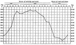 Circadian variation in body temperature, ranging from about 37.5 °C from 10 a.m. to 6 p.m., and falling to about 36.4 °C from 2 a.m. to 6 a.m.