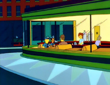 The episode parodies the series The Untouchables, with the character of Rex Banner based on Robert Stack's portrayal of Eliot Ness,[1][8] and the voice of the narrator being based on that of Walter Winchell.[5] Barney leaving flowers outside the Duff brewery is, according to show runner Josh Weinstein, a reference to people leaving flowers at the grave sites of various Hollywood figures like Rudolph Valentino and Marilyn Monroe.[3] The shot of the diner quotes Edward Hopper's Nighthawks painting.[3]