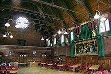 The Great Hall is one of the largest and grandest dining halls in Cambridge. When it was built in 1889 it was the largest college hall in Cambridge.[18] It now houses one of the college's most notable works of art – the celebrated Pre-Raphaelite piece by Jane Benham Hay known as 'The Florentine Procession', painted in the 1860s and winning 'Picture of the Year' in the 1867 Saturday Review.[19] Also encircling the Hall are portraits of former Principals of the college.[20] The Hall itself features a hammer-beam roof, American walnut panelling, a gallery, rose windows, a fleche,[5] and a bell originating from the old college in London which sounds before the College Grace is read at Formal dinner.