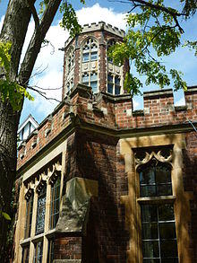 The original Victorian Cavendish College buildings were constructed in 1876 in the Gothic Revival style, using a combination of red Suffolk brick and Bath stone dressings. One of the most notable features is an oak doorway with an ogee arch flanked above by ornamental grotesques.[5] Several years later, the Cambridge architect William Wren designed additions to the eastern end of the college buildings in the Neo-Gothic style – now occupied by the Principal's office.[5] The castellated tower is the tallest part of the original college buildings, and it is possible to see the spires of Ely Cathedral on a clear day from its uppermost floor.[17]