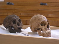 The remains of an individual that would have stood about 1.1 m (3 ft 7 in) in height were discovered in 2003 at Liang Bua on the island of Flores in Indonesia. Partial skeletons of nine individuals have been recovered, including one complete skull, referred to as "LB1".[2][3] These remains have been the subject of intense research to determine whether they represent a species distinct from modern humans.
