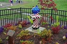 The park also features two former fire hydrants donated by Clean Water Services and painted by a local dog association.[3] One hydrant is decorated with cartoon dog characters, while the other is painted with an American flag and known as the "Hondo Memorial Hydrant".[3] The hydrant with the American flag is a memorial to the namesake of the park and is situated atop an 18-inch (460 mm) base. Within a week of opening officials removed the hydrant painted as an American flag over concerns of disrespect for the flag if dogs used the hydrant,[5] but it was later returned and fenced off to prevent such incidents.[6] The controversy over the flag painted hydrant received international news.[7][8][9]