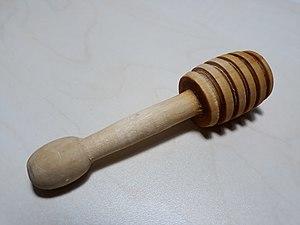 One method of using the tool is to dip the grooved end into the liquid, then slowly twirl the handle between the thumb and fingers while in transport, to prevent dripping.[3] It is commonly used to drizzle honey on bread, biscuits, or other foods of that nature.[4] The tool is sometimes made of plastic[4] or glass.