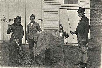 In December 1889, a letter written by a resident of St. Lawrence named Charles J. H. Saunders appeared in the Bromley Record. Saunders said he had conversed with many elderly residents of Thanet on the subject of hoodening, and that they informed him that the custom had been discontinued around fifty years previously, after a woman in Broadstairs was so scared by the hooden horse that she died.[53] He added that a horse's skull was rarely used, "owing to the difficulty procuring one", and that the wooden head was thus typically used as a replacement.[54] He said the hoodening company typically consisted of a "Jockey" who placed himself on the back of the individual carrying the horse, and that it was the "sport" that bystanders attempted to throw him off, resulting in violence. The horse and jockey were also accompanied by two singers, two attendants, and an individual dressed as an "old woman" carrying a broom; when the company knocked on people's doors, it was the old woman's job to sweep the inhabitants feet away with her broom and to chase any girls until being paid off with money or refreshments.[54] He was of the opinion that the custom had been restricted to the Isle of Thanet, noting that locals informed him that it had been carried out in Ramsgate, St. Lawrence, Minster, St. Nicholas, Acol, Monkton, and Birchington.[54] Contradicting this were several letters published in the Church Times in January 1891 which attested to the continuing practice of the hooden horse tradition at both Deal and Walmer.[55]