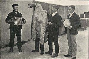 Hoodening was part of a wider "hooded animal" tradition that Cawte identified as existing in different forms in various parts of Britain.[10] Features common to these customs were the use of a hobby horse, the performance at Christmas time, a song or spoken statement requesting payment, and the use of a team who included a man dressed in women's clothing.[11] In South Wales, the Mari Lwyd tradition featured troupes of men with a hobby horse knocking at doors over the Christmas period.[12] In an area along the border between Derbyshire and Yorkshire, the Old Tup tradition featured groups knocking on doors around Christmas carrying a hobby horse that had a goat's head.[13] The folklorist Christina Hole drew parallels between hoodening and the Christmas Bull tradition recorded in Dorset and Gloucestershire.[14] In south-west England, there are two extant hobby horse traditions—the Padstow 'Obby 'Oss festival and Minehead Hobby Horse—which take place not at Christmas time but on May Day.[15] Although the origins of these traditions are not known with any certainty, the lack of any late medieval references to such practices may suggest that they emerged from the documented elite fashion for hobby horses in the sixteenth and seventeenth centuries.[16] In this, the hooded animal traditions may be comparable to England's Morris dance tradition, which became a "nation-wide craze" in the sixteenth and seventeenth centuries before evolving into "a set of sharply delineated regional traditions".[17]