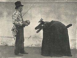 Surviving sources testify to the fact that while there was some variation in the hoodening tradition as it was practised by different individuals in different parts of East Kent, it was nevertheless "on the whole remarkably uniform".[2] The hooden horse, which was at the centre of the tradition, was usually made out of a wooden horse's head affixed to a pole about four feet long, with a hinged jaw that was moved by a string.[2] This horse was then carried aloft by an individual who was concealed beneath a dark cloth.[3] As part of the hoodening custom, a team of "hoodeners", consisting of between four and eight men, would carry the horse through the streets. This team included the horse operator, a "Groom", "Driver", or "Waggoner" who carried a whip and led the horse by a bridle, a "Jockey" who would attempt to mount the horse, a "Mollie" who was a man dressed as a woman, and one or two musicians.[2] All of the men were farm labourers, usually being those who worked with horses.[4]
