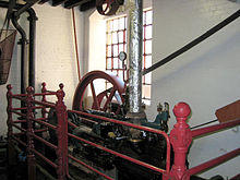 Hook Norton Brewery uses a Buxton & Thornley steam engine that has powered most of the machinery in the brewery since 1899. It is the last commercially working open crank stationary steam engine in the UK.[3] It is a small, simple engine consisting of a cylinder, flywheel, connecting rods and little else. The engine drives a system of shafts and belts connected to most of the machinery in the brewery; different sections of machinery can be engaged and disengaged by levers which slide drive belts on and off their wheels. Where there are gears in the lineshafting, each pair consists of one iron and one wooden wheel. Thus, if any machinery should jam, only a few wooden teeth will be damaged and can then be replaced by the brewery's mechanics instead of needing a complex iron casting.