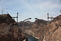 Construction required hoisting workers and up to 50 short tons (45 t) of materials 890 feet (270 m) above the Colorado River using 2,300 ft (700 m)-long steel cables held aloft by a "high-line" crane system.[16] High winds caused a cableway failure in September 2006, resulting in a further two-year delay.[18] The approach spans, consisting of seven pairs of concrete columns—five on the Nevada side and two on the Arizona side—were completed in March 2008.[16] In November 2008, construction worker Sherman Jones died in an accident.[18]