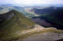 Hopegill Head seen from Grisedale Pike. Hobcarton Crag is beneath the fell. The grassy hill on the left is Sand Hill. | |