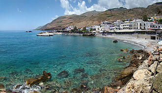 Hóra Sfakíon is a small village with a main harbourfront of tavernas, two minimarkets, a butcher, and a bakery. There is a quiet local beach immediately west of the village, and several pebbly beaches nearby. Hóra Sfakíon has a variety of tourist accommodations: rooms, studios, and apartments. The local economy is based on tourism, fishing, olive-oil production, and sheep and goat herding.