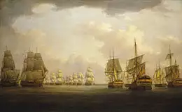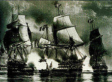 On 8 March, news reached Hotham that the French fleet was at sea and heading for Corsica. He immediately set out to intercept them, and Nelson eagerly anticipated his first fleet action. The French were reluctant to engage and the two fleets shadowed each other throughout 12 March. The following day two of the French ships collided, allowing Nelson to engage the much larger 84-gun Ça Ira for two and a half hours until the arrival of two French ships forced Nelson to veer away, having inflicted heavy casualties and considerable damage.[94] The fleets continued to shadow each other before making contact again, on 14 March, in the Battle of Genoa. Nelson joined the other British ships in attacking the battered Ça Ira, now under tow from Censeur. Heavily damaged, the two French ships were forced to surrender and Nelson took possession of Censeur. Defeated at sea, the French abandoned their plan to invade Corsica and returned to port.[95]