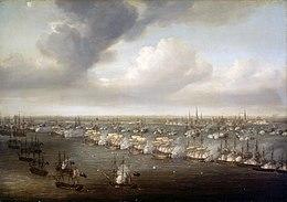 Shortly after his arrival in England Nelson was appointed to be second-in-command of the Channel Fleet under Lord St Vincent.[184] He was promoted to Vice Admiral of the Blue on 1 January 1801[185] and travelled to Plymouth, where on 22 January he was granted the freedom of the city. On 29 January 1801, Emma gave birth to their daughter, Horatia.[186] Nelson was delighted, but subsequently disappointed when he was instructed to move his flag from HMS San Josef to HMS St George in preparation for a planned expedition to the Baltic.[187] Tired of British ships imposing a blockade against French trade and stopping and searching their merchantmen, the Russian, Prussian, Danish and Swedish governments had formed an alliance to break the blockade. Nelson joined Admiral Sir Hyde Parker's fleet at Yarmouth, from where they sailed for the Danish coast in March. On their arrival, Parker was inclined to blockade Denmark and control the entrance to the Baltic, but Nelson urged a pre-emptive attack on the Danish fleet at harbour in Copenhagen.[188] He convinced Parker to allow him to make an assault and was given significant reinforcements. Parker himself would wait in the Kattegat, covering Nelson's fleet in case of the arrival of the Swedish or Russian fleets.[189]