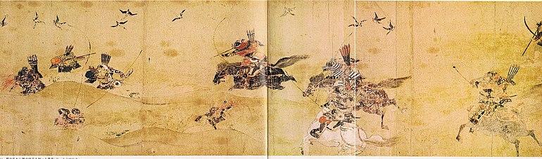 The history of Japanese horse archery dates back to the 4th century.[42] It became popular in Japan, attracting crowds. The emperor found that the crowds were not appropriate to the solemn and sacred nature of the occasion, and banned public displays in 698.[43] Horse archery was a widely used combat technique from the Heian Period to the Warring States Period.[44] Nasu no Yoichi, a samurai of the Kamakura Period is the most famous horse archer in Japan. Three kinds of Japanese horse archery (Kasagake, Yabusame, and Inuoumono (dog shooting)) were defined.