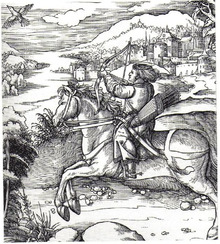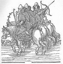 German and Scandinavian medieval armies made extensive use of mounted crossbowmen. They would act not only as scouts and skirmishers, but also protect the flanks of the knights and infantry, chasing away enemy light cavalry. When the battle was fully engaged, they would charge at the enemy flank, shoot a single devastating volley at point-blank range and then attack the enemy with swords, without reloading. In some instances, mounted crossbowmen could also reload and fire continuously on horseback if they used specific "weaker" crossbows that could be reloaded easily, as mentioned in the 13th-century Norwegian educational text Konungs skuggsjá.[11] The invention of spanning mechanisms such as the goat's foot lever and the cranequin allowed mounted crossbowmen to reload and fire heavy crossbows on horseback.[12][13]