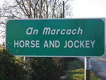 The origin of the English placename for the village is unclear. Bassett's 1889 directory of County Tipperary listed the village, noting that it had six houses.[1] Some people believe that the placename may have been derived from a public house of the same name. However, although there is currently a hotel called the Horse and Jockey, in the mid-20th Century the only public house in the village, from which the current hotel was subsequently developed, was known simply as O'Keeffe's, after the family which owned it. Another tentative suggestion is that, since the village was on a mail coach route, it may have been the location of one of the Bianconi Inns established by the transport magnate, Charles Bianconi, and that the name may be somehow connected with such an establishment, if it existed. If there was such an inn, it may what is indicated by the use of italics in the rendering of the name The Horse and Jockey on a 19th-century map in the Ordnance Survey First Edition 6" Series.[2] If so, the map appears to indicate that the inn was on the north-east corner of the village, instead of the south side of the village where the public house was located in mid-20th century.