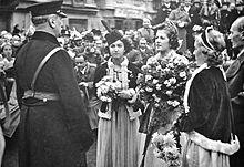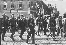 In August 1938, when Horthy, his wife, and some Hungarian politicians took a special train from Budapest to Germany, SA and other National Socialist formations ceremonially welcomed the delegation at the Passau train station. The train then continued to Kiel for the christening of the German cruiser Prinz Eugen.[36]
