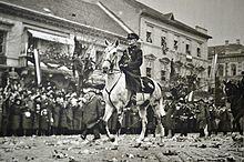 Three months later, after the Munich Agreement put control of Czechoslovakia's Sudetenland in Hitler's hands, by the First Vienna Award Hungary annexed some of the south-eastern parts of Czechoslovakia. Horthy enthusiastically rode into the re-acquired territories at the head of his troops, greeted by emotional ethnic Hungarians: "As I passed along the roads, people embraced one another, fell upon their knees, and wept with joy because liberation had come to them at last, without war, without bloodshed."[24] But as "peaceful" as this annexation was, and as just as it may have seemed to many Hungarians, it was a dividend of Hitler's brinksmanship and threats of war, in which Hungary was now inextricably complicit. Hungary was now committed to the Axis agenda: on 24 February 1939, it joined the Anti-Comintern Pact, and on 11 April, it withdrew from the League of Nations. American journalists began to refer to Hungary as "the jackal of Europe".[38]