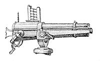 The term "Hotchkiss gun" also refers to the Hotchkiss revolving cannon, a rotating barrel weapon invented in 1872 by Benjamin B. Hotchkiss (1826–1885), founder of Hotchkiss & Co. It was used by German authorities in the 19th century. Though superficially resembling a Gatling gun the internals are very different, having only one firing pin rather than a firing mechanism for every barrel.[1] It was a built-up, rifled, rapid-fire gun of oil-tempered steel, having a rectangular breechblock which moved in a mortise cut completely through the jacket. It was designed to be light enough to travel with cavalry, and had an effective range beyond that of rifled small-arms.