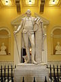 Houdon's portrait sculpture of Washington was the result of a specific invitation by Benjamin Franklin to cross the Atlantic in 1785, specifically to visit Mount Vernon, so that Washington could model for him. Washington sat for wet clay life models and a plaster life mask. These models served for many commissions of Washington, including the standing figure commissioned by the Virginia General Assembly, for the Virginia State Capitol in Richmond.[1] Numerous variations of the Washington bust were produced, portraying him variously as a general in uniform, in the classical manner showing chest musculature, and as Roman Consul Lucius Quinctius Cincinnatus clad in a toga. A cast of the latter is located in the Vermont State House.