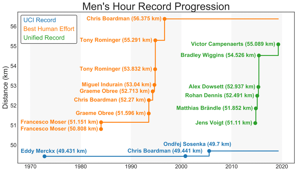 The above chart depicts the progression of the men's hour record over time (click to enlarge). Blue markers indicate attempts made under the UCI hour record, orange markers indicate attempts made under the UCI best human effort rules, and green markers indicate attempts made under the unified rules.