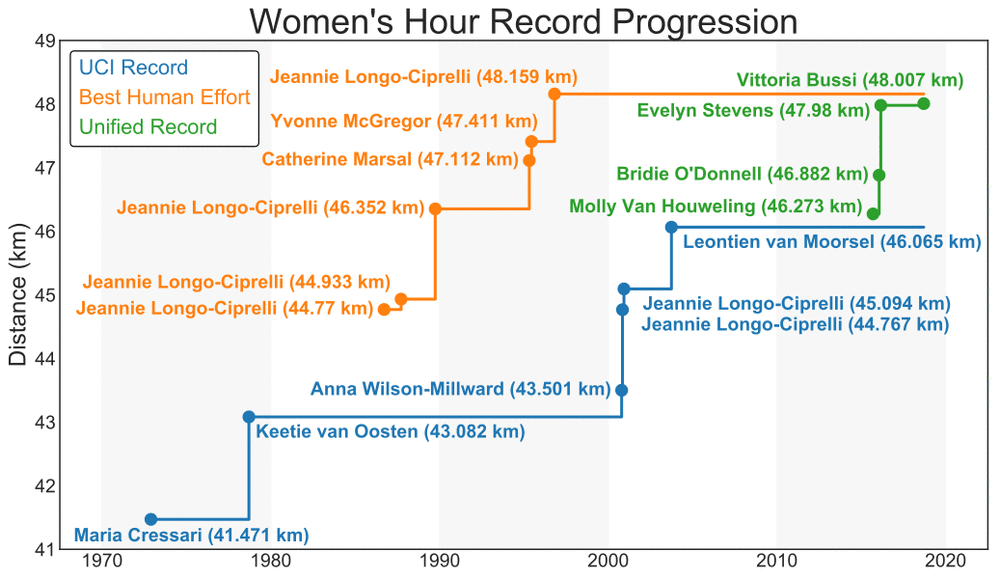 The above chart depicts the progression of the women's hour record over time (click to enlarge). Blue markers indicate attempts made under the UCI hour record, orange markers indicate attempts made under the UCI best human effort rules, and green markers indicate attempts made under the unified rules.