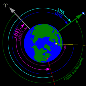 where LHAobject is the local hour angle of the object, LST is the local sidereal time, is the object's right ascension, GST is Greenwich sidereal time and is the observer's longitude (positive east from the prime meridian).[3] These angles can be measured in time (24 hours to a circle) or in degrees (360 degrees to a circle)—one or the other, not both.