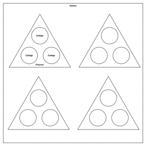 To elect the members of the House, Puerto Rico is divided into forty (40) representative districts that do not follow a particular pattern; they are strictly based on a similar number of inhabitants. These districts are in turn divided into one or more precincts: an electoral division which, in turn, is constituted by colleges.[13] For each district, citizens may vote only for one candidate from the district in which they declared residence by first-past-the-post. District representatives are expected to give priority to matters related to the district they represent but are not required to do so by law.