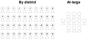 Structurally, the House is normally composed of 51 members. Forty are elected from single-member districts across the commonwealth (with one representative per district), while 11 are elected at-large.[a]