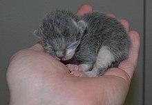 Data on the reproductive capacity of more than 2,300 free-ranging queens were collected during a study between May 1998 and October 2000. They had one to six kittens per litter, with an average of three kittens. They produced a mean of 1.4 litters per year, but a maximum of three litters in a year. Of 169 kittens, 127 died before they were six months old due to a trauma caused in most cases by dog attacks and road accidents.[9] The first litter is usually smaller than subsequent litters. Kittens are weaned between six and seven weeks of age. Queens normally reach sexual maturity at 5–10 months, and males at 5–7 months. This varies depending on breed.[154] Kittens reach puberty at the age of 9–10 months.[152]