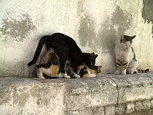The social behavior of the domestic cat ranges from widely dispersed individuals to feral cat colonies that gather around a food source, based on groups of co-operating females.[98][99] Within such groups, one cat is usually dominant over the others.[100] Each cat in a colony holds a distinct territory, with sexually active males having the largest territories, which are about 10 times larger than those of female cats and may overlap with several females' territories. These territories are marked by urine spraying, by rubbing objects at head height with secretions from facial glands, and by defecation.[84] Between these territories are neutral areas where cats watch and greet one another without territorial conflicts. Outside these neutral areas, territory holders usually chase away stranger cats, at first by staring, hissing, and growling and, if that does not work, by short but noisy and violent attacks. Despite this colonial organization, cats do not have a social survival strategy or a pack mentality, and always hunt alone.[101]