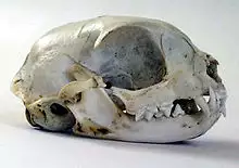 The cat skull is unusual among mammals in having very large eye sockets and a powerful specialized jaw.[62]:35 Within the jaw, cats have teeth adapted for killing prey and tearing meat. When it overpowers its prey, a cat delivers a lethal neck bite with its two long canine teeth, inserting them between two of the prey's vertebrae and severing its spinal cord, causing irreversible paralysis and death.[63] Compared to other felines, domestic cats have narrowly spaced canine teeth relative to the size of their jaw, which is an adaptation to their preferred prey of small rodents, which have small vertebrae.[63] The premolar and first molar together compose the carnassial pair on each side of the mouth, which efficiently shears meat into small pieces, like a pair of scissors. These are vital in feeding, since cats' small molars cannot chew food effectively, and cats are largely incapable of mastication.[62]:37 Although cats tend to have better teeth than most humans, with decay generally less likely because of a thicker protective layer of enamel, a less damaging saliva, less retention of food particles between teeth, and a diet mostly devoid of sugar, they are nonetheless subject to occasional tooth loss and infection.[64]