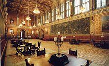 The decorative theme of the room is the legend of King Arthur, considered by many Victorians the source of their nationhood.[84] Five frescos painted by William Dyce between 1848 and 1864 cover the walls, depicting allegorical scenes from the legend. Each scene represents a chivalric virtue; the largest, between the two doors, is entitled Admission of Sir Tristram to the Round Table and illustrates the virtue of Hospitality.[73] Seven were originally commissioned but the remaining two paintings were not carried out due to the artist's death, and on the wallpapered panels flanking the Chair of State hang oil portraits of Queen Victoria and Prince Albert by Franz Xaver Winterhalter.[82][note 1] Other decorations in the room are also inspired by the Arthurian legend, namely a series of 18 bas-reliefs beneath the paintings, carved in oak by Henry Hugh Armstead,[73] and the frieze running below the ceiling, which displays the attributed coats of arms of the Knights of the Round Table.[85] The ceiling itself is decorated with heraldic badges, as is the border of the wooden floor[69]—which, as can be seen in the adjacent image, is left exposed by the carpeting.