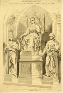 The room also contains a statue of Queen Victoria, seated on a throne (itself placed on a pedestal) and holding a sceptre and a laurel crown, which show that she both governs and rules.[73] This figure is flanked by allegorical statues of Justice and Clemency—the former with a bare sword and an inflexible expression and the latter showing sympathy and offering an olive branch.[96] The sculptural ensemble, made of white marble and carved by John Gibson in 1855, reaches 2.44 metres (8 ft) in height; its size has long been considered out of proportion with the fittings of the Prince's Chamber, and the flanking statues ended up in storage between 1955 and 1976. However, the size and location of the group, in the archway opposite the doors to the Royal Gallery (which are removed before State Openings of Parliament to facilitate the royal procession), indicate that it was meant to be seen from a distance, and to symbolically remind the monarch of their royal duties as they would walk down the Royal Gallery on their way to deliver their speech.[73][97]