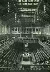 Following the destruction of the Commons Chamber, the Lords offered their own debating chamber for the use of the Commons; for their own sittings, the Queen's Robing Room was converted into a makeshift chamber.[27] The Commons Chamber was rebuilt after the war under the architect Sir Giles Gilbert Scott, in a simplified version of the old chamber's style. The work was undertaken by John Mowlem & Co.,[28] and construction lasted until 1950.[29] The Lords Chamber was then renovated over the ensuing months; the Lords re-occupied it in May 1951.[30]