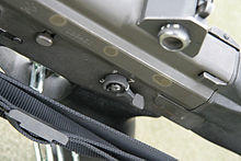 The Type 89 rifle is equipped with an integrated bipod[20] to facilitate accuracy, which was also on the Type 64. However, unlike the bipod on the Type 64, the version on the Type 89 is easily removed as it is clamped onto the barrel behind the bayonet lug with a clothes-pin style spring mechanism and retained with a lever-like lock. Also, the Type 89's handguard is molded with inlets along its lower edges in order to accommodate the legs of the bipod if they are folded inwards for storage.