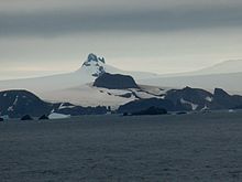 Hrabar Nunatak from English Strait, with Sharp Peak, Livingston Island in the background.
