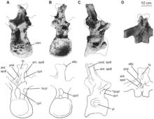 A total of four cervical vertebrae were recovered from the holotypic quarry. Two of these are fragmentary, whereas the other two vertebrae are nearly complete. According to the quarry map, the two poorly preserved cervical vertebrae were articulated when found and belong to a more anterior part of the cervical series than the nearly complete vertebrae. Little anatomical information can be gleaned from the two fragmentary cervical vertebrae aside from some measurements.[2]
