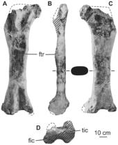 Pang and Cheng tentatively suggested that "Titanosaurus" falloti be referred to Huabeisaurus.[3] However, "T." falloti is only represented by femoral remains, and its femur bears no uniquely shared features with Huabeisaurus. Furthermore, the femora of Huabeisaurus and "T." falloti differ in the bevel of the distal end versus the long axis of the bone, so the two cannot represent the same genus.[2]