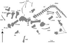 Limb and girdle elements from the left and right sides of the body closely match each other in size and are the appropriate size to belong to the same individual as the vertebrae and ribs. The disposition of bones in the quarry is approximately as expected if the animal were lying on its left side in an opisthotonic pose, but nearly all bones show some disorientation and disarticulation: the cervical vertebrae are arranged along a curved line, and extending along this tight curve (approximately) sit two of the dorsal vertebrae followed by the sacrum and caudal vertebrae. The sacrum and first three caudal vertebrae were found in articulation and in line with the remaining articulated caudal vertebrae; others are present after a gap of about 0.5 metres (1.6 ft). Twenty-seven caudal vertebrae are shown on the quarry map, but 30 were found in the collection, and pre-restoration photos indicate that 32 were originally present. Many of the chevrons were found articulated with their respective caudal vertebrae. The left and right scapulae were recovered on the left and right sides of the body, respectively. The left radius was found about midway between the pectoral girdle elements. Left and right femora, pubes, and ilia were located close to one another and all of these were found near the sacrum. The sacrum is depicted with its left side facing upwards on the quarry map, but this might have been an error because the left side of the sacrum is damaged and the left ilium is missing. The elements of the left and right crura were found in close association. Dorsal rib fragments were scattered across the quarry area. In sum, some degree of dispositioning occurred to HBV-20001 before or during burial, resulting in loss and disarticulation of some elements, but the disposition, overall agreement in size, and lack of duplication of bones suggests the presence of a single sauropod individual at this locality.[2]