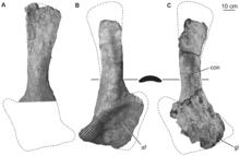The left radius is damaged at its proximal and distal ends. The radius is gracile, with a midshaft width to length ratio of 0.12. In anterior view, the lateral face of the shaft is straight, whereas the medial face is concave. The anteroposteriorly expanded proximal end has a prominent ridge on its lateral face. The proximal end has an approximately oval outline with a pointed anterior process and broadly rounded posterior process. The proximomedial margin is nearly straight, whereas the proximolateral margin is concave anteriorly and convex posteriorly. The oval cross-section of the upper shaft gradually transforms into a rounded D-shape at mid-shaft, with the long axis of the cross section extending transversely. This ‘D’ shape becomes more anteriorly compressed towards the distal end, with a transversely rounded anterior face and increasingly flattened posterior face. This is associated with the strong transverse expansion of the distal shaft and distal end of the bone, as originally described as a twisting of the bone. Strong transverse expansion of the distal radius is normally found only in titanosaurs (e.g., Alamosaurus and Jainosaurus) and is considered a local autapomorphy of Huabeisaurus. Posterolateral ridges are weak to absent along the distal half of the bone and do not extend further proximally.[2]