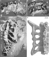 A nearly complete sacrum consisting of six vertebrae was recovered from the quarry, originally only lacking some ribs. The original description of Huabeisaurus suggested that only five sacral vertebrae were present based on the number of sacral ribs and intercostal foramina. The sacrum is currently heavily restored with plaster, but pre-restoration photographs show the sacrum in two oblique dorsal views and right lateral view. These photographs reveal that the last dorsal vertebra was taphonomically shifted posteriorly and to the right, crushing the right first sacral rib. Pre-restoration photographs and the number of broken sacral neural spines currently visible indicate that the sacrum was composed of at least six vertebrae. The first vertebra crushed into the sacrum could represent a seventh sacral vertebra; because the ribs of this dorsal vertebra are not observable firsthand or in photographs, but it cannot be verified whether or not these ribs contacted the ilium. The vertebra was interpreted as the last dorsal vertebra because: its neural spine does not appear to be fused to the neural spine posterior to it, and the usual sacral vertebral count for all but the most basal somphospondylans is six (with seven vertebrae in Neuquensaurus as the only derived exception).[2]