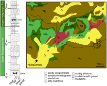 The geology of the type locality of the Huiquanpu Formation was described in a series of reports. The specimen was found near the base of the upper member of the Huiquanpu Formation, in a fluvially deposited silty mudstone. This locality has also produced the ankylosaur Tianzhenosaurus, theropod material referred to cf. Szechuanosaurus campi (now regarded as a nomen dubium), and indeterminate hadrosaurid material.[2] This species also coexisted with ostracods and charophytes,[3] and the ankylosaurian Shanxia, considered by Weishampel et al. to be ankylosauria indet.[5]